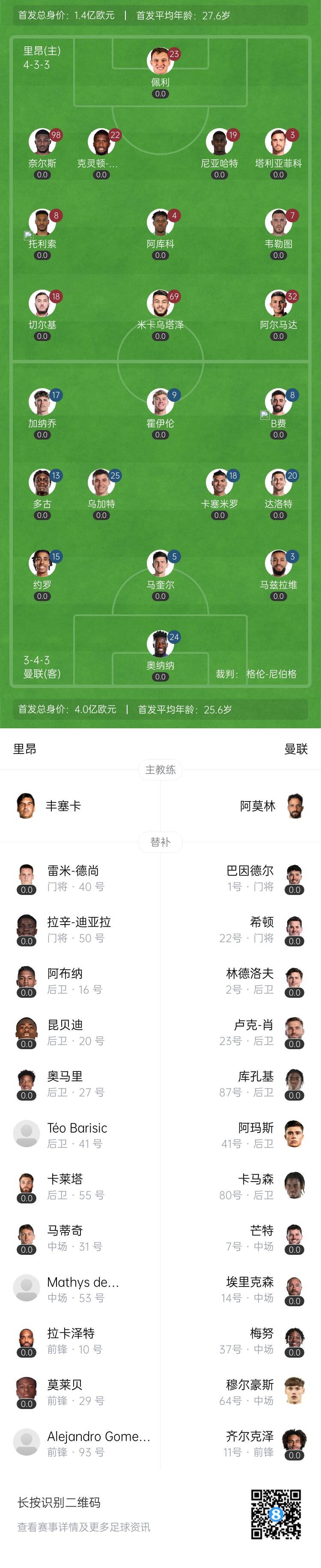 里昂首发:23-佩利、98-奈尔斯、22-克林顿-马塔、19-尼亚哈特、3-塔利亚菲科、4-阿库科、8-托利索、7-韦勒图、18-切尔基、32-阿尔马达、69-米卡塔德泽