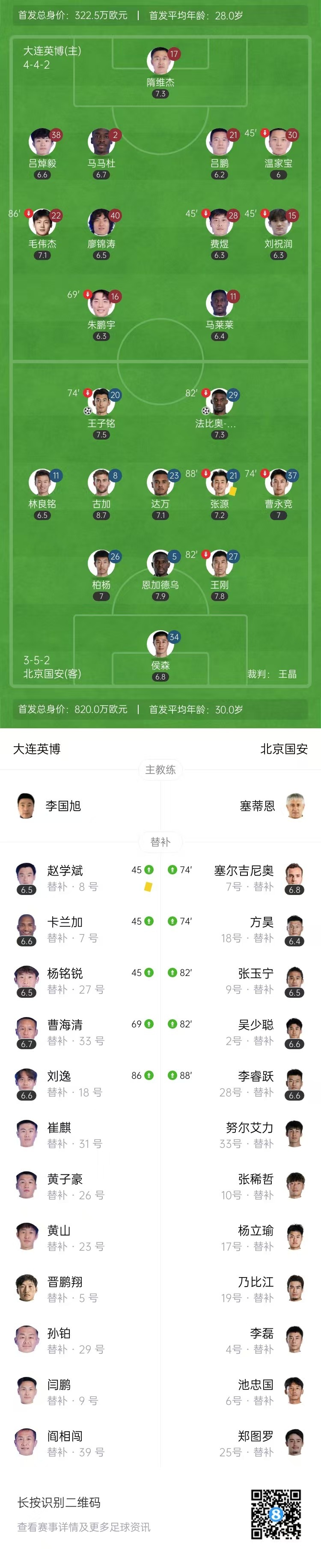 第18分钟,古加左路下底传中,王子铭禁区内头球攻门得手,北京国安1-0大连英博。↓
